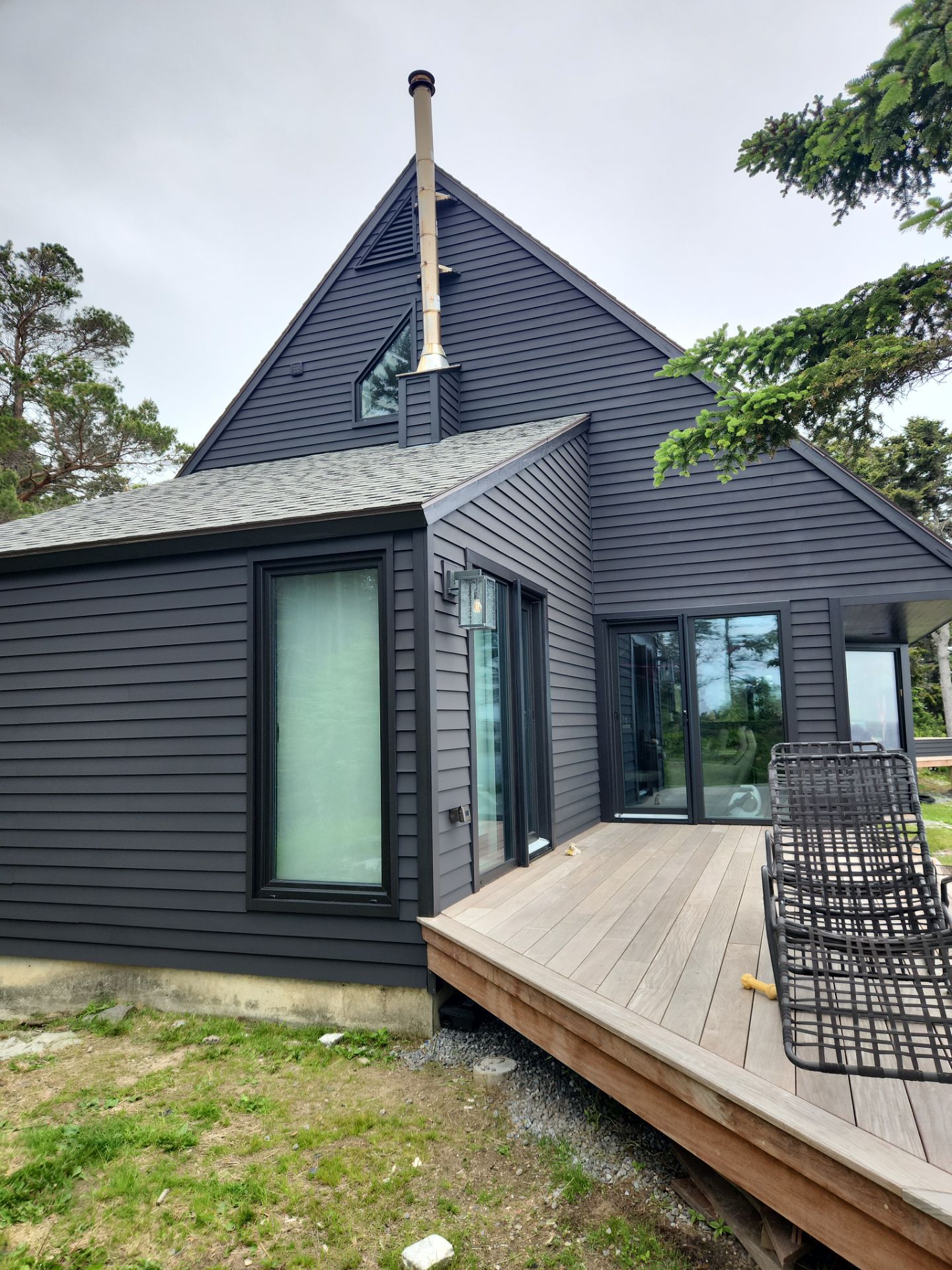 Both surfaces were coated in Sherwin-Williams Black Magic (SW 6991) for a cohesive monochrome finish. The siding received WoodScapes Exterior Acrylic Solid House Stain, while the trim was finished with Emerald Urethane Trim Enamel.